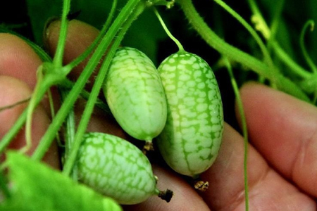 拇指西瓜:學名佩普基諾,僅有3厘米長。內瓤為青綠色,口感如黃瓜般清脆爽口,營養價值比普通西瓜高,可直接食用。